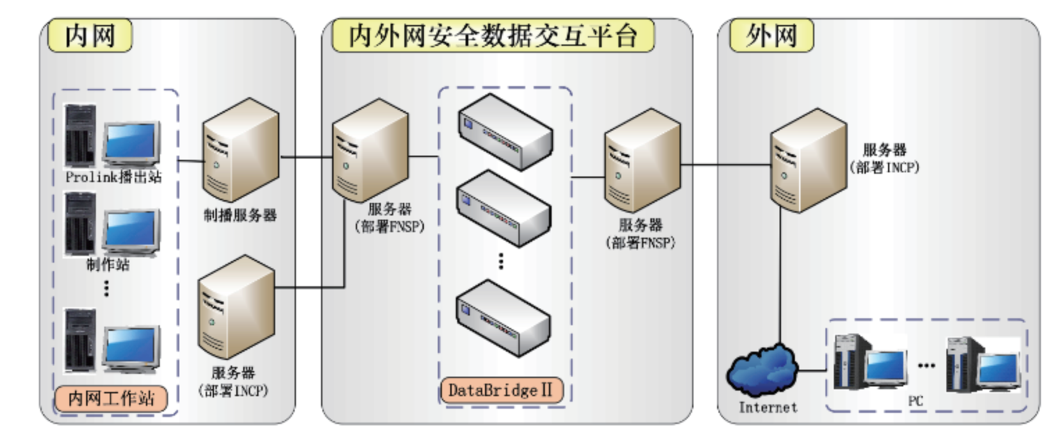 广播业务已经全面步入网络化数字化时代,互联网和移动互联网承载着日常的节目信息采集、编辑等工作。而由于安全播出的要求,电台内网和外网之间属于完全的物理隔离,导致大多数应用系统处于“孤岛”和“专用独立”的状态,无法进行安全的节目交互,实现节目资源共享。