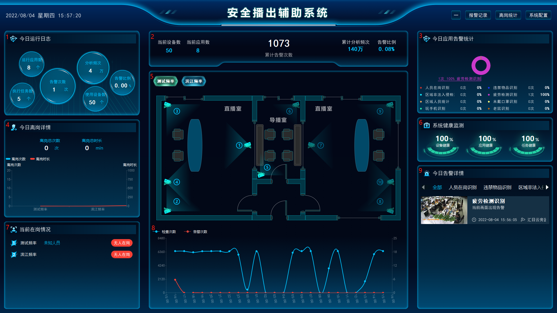 安播辅助提示系统能够实现多路视频监控的集中展示,并通过提前预设的报警监测策略和报警条件设置,实时对各路视频画面进行抽帧分析,当检测到画面中出现如人员在岗/离岗、违禁物品、区域非法入侵、人员疲劳等安全播出隐患事件时,自动报警并提示值班人员,系统会将报警信息和相关视频画面记录下来以满足未来的回溯查看。系统还会针对安播辅助系统的AI执行任务和成果进行数据统计展示,以分析播出事故的频次和潜在原因,来对安全播出或者报警阈值进行针对性的调整优化。