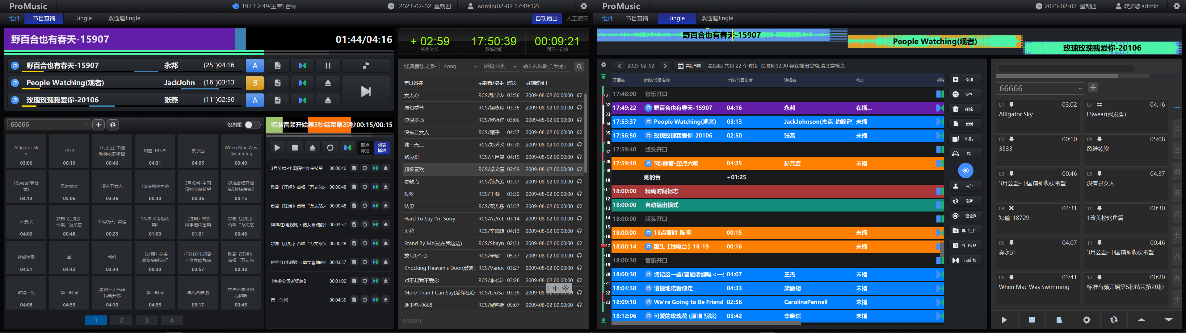 Promusic播出系统是联汇科技积累多年行业经验,独立研发、精心打造的一套符合我国音乐频率播出特点的自动化数字播出系统,系统重视节目间节奏风格衔接、具备自动化编单业务、强调节目编目属性、保障安全自动播出,采用实现新型的数据安全模式和网络化设计,满足广播电台在音乐频道的网络化管理和资源共享要求。Promusic播出系统具备多级热备机制,支持包括主、备、本播出,精细化权限控制功能,具备多级权限设置与定义,同时,提供强大的编排功能,编排工作流程化,分工化,电台总监或管理员指定时段划分,电台总监或主持人指定各时段的排单策略和抽单策略,系统自动根据策略,创建编排节目单,同时结合广告系统,自动装配完整的播出单,真正实现了所见即所播。