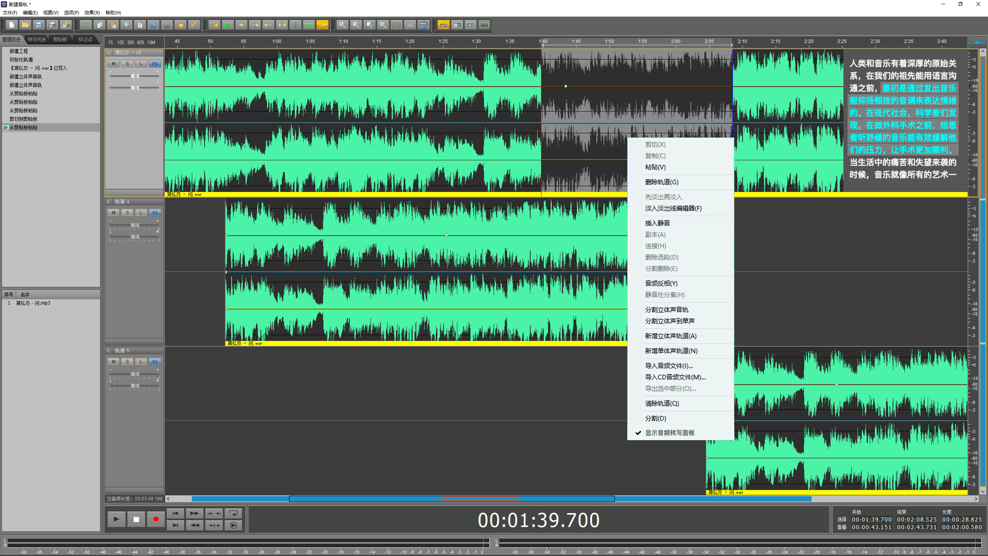 音频转文字:导入音频后自动识别翻译成文字并展示在波形右侧,鼠标点击或选中波形时,将同步选中文字轨,波形播放时文字面板同步滚屏。
